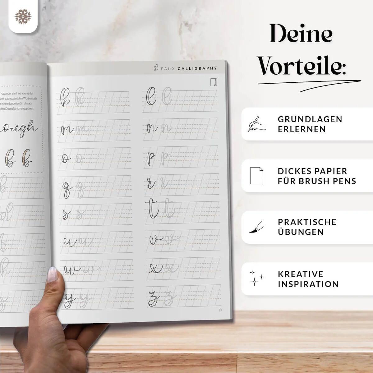 - Enthält: Erklärungen für Anfänger, 6 verschiedene Alphabete, Gestaltungen & Effekte, Spruchgestaltung, Übungsvorlagen, achtsame Impulse für deine Kreativität