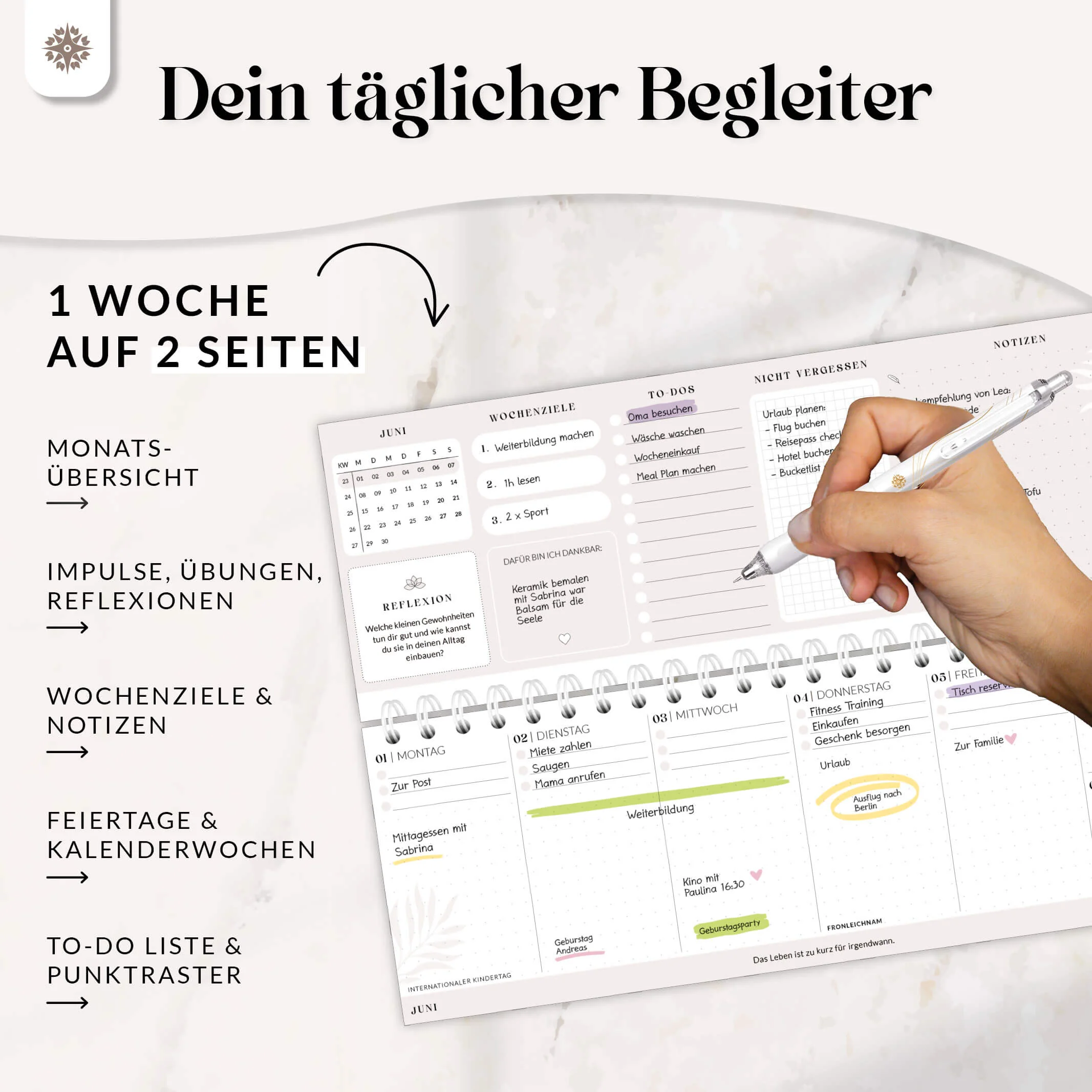 - Nützliche Zusatzseiten wie Kontakte, Urlaubsplanung, Jahresübersicht, Schulferien, Jahresziele und Produktivitätstipps